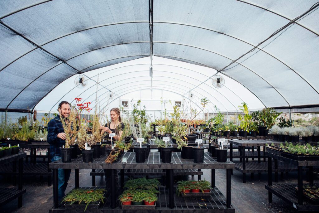Ben Naman and Alli Adams work with medicinal plant species in greenhouses at the San...