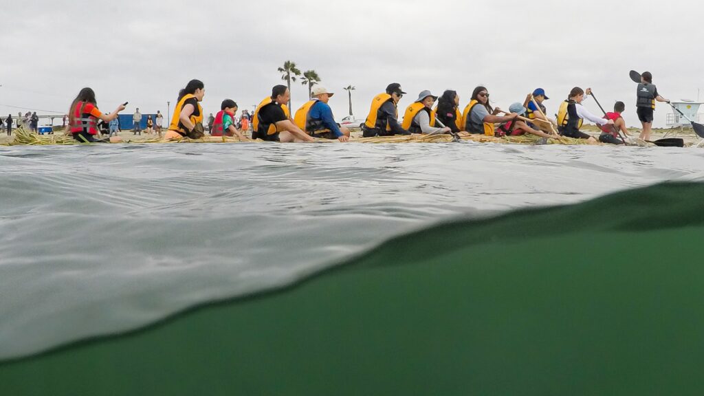 Participants from Kumeyaay Community College and Native Like Water crew a large ha kwaiyo (tule...
